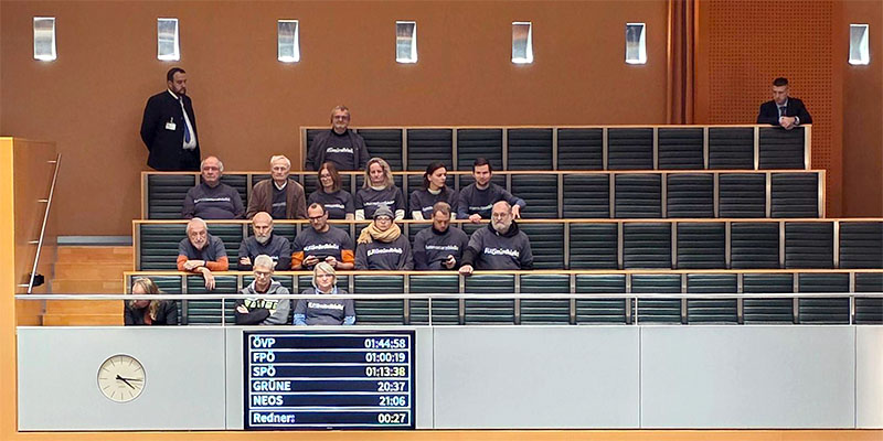 18. Dezember 2025: Bei der letzten Landtagssitzung des Jahres 2025 waren wir wieder gemeinsam mit unseren Mitstreiter:innen von den Initiativen #unsernotarztbleibt auf der Galerie des NÖ Landhaus vertreten. Vom Rauswurf nach unserem Protest bei der letzten Sitzung ließen wir uns nicht abhalten, wieder auf unsere Kritik an bestimmten Maßnahmen des Gesundheitsplan 2040+ aufmerksam zu machen.